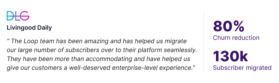 Choosing Loop Subscriptions allows businesses to optimize their subscription models, unlocking benefits that drive growth and success in the competitive eCommerce market. For instance, Livingood Daily reduced its churn rate by 5X after switching from Recharge to Loop. Learn more about their success here.