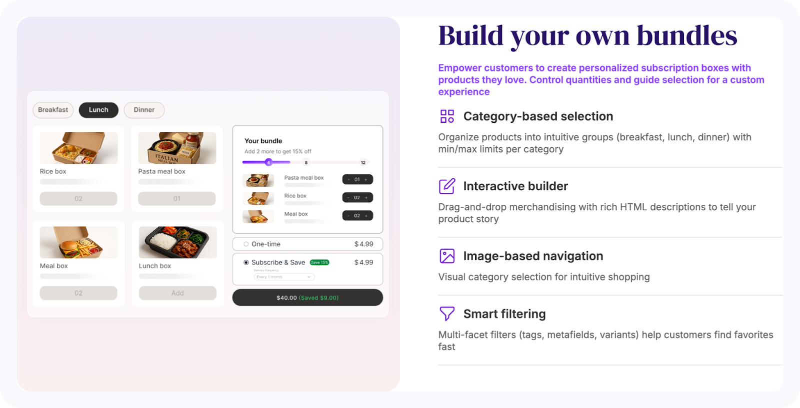 You configure category rules: minimum 6 items, maximum 12, at least 2 from "breakfast," no more than 4 from "premium." Customers build within constraints. The portal enforces limits. For meal prep, you can display nutritional metadata (protein, carbs, fats, calories) directly in the swap interface.