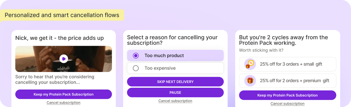 Step 3 — Offers page: Only for subscribers who didn't save earlier. Personalized by order count, LTV, subscription age. Cancellation flows support 20+ segmentation triggers.