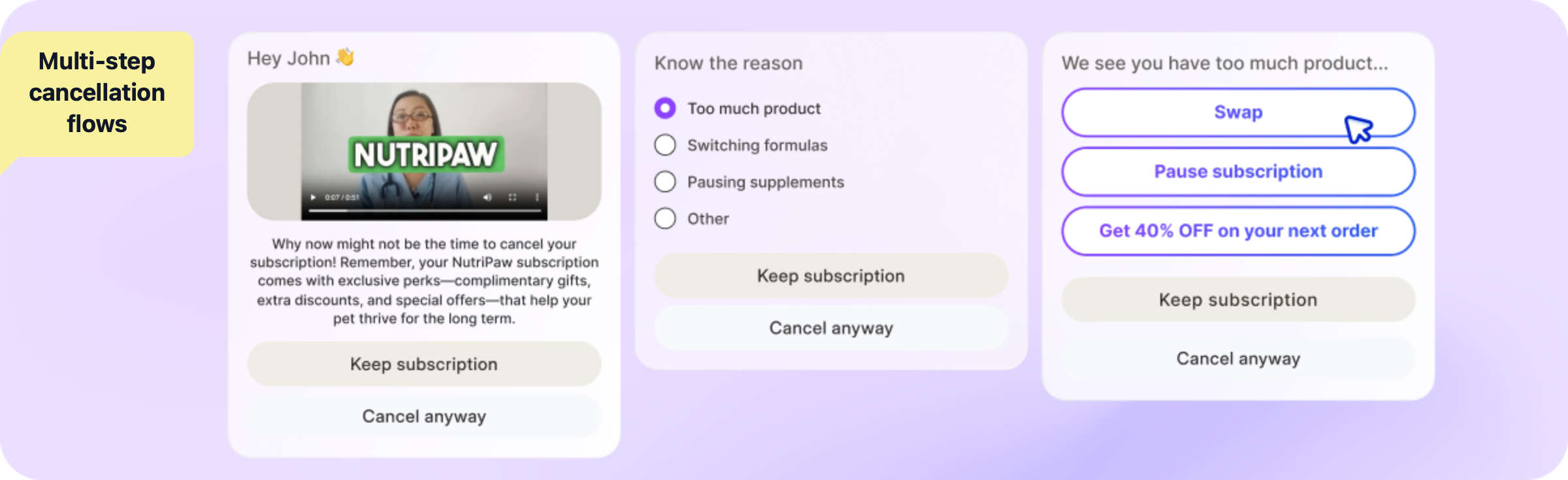 The cancellation attempt. When a subscriber clicks "Cancel subscription" on Loop, they enter a multi-step flow with reason-based branching. A subscriber canceling because the product is too expensive sees a discount offer. One canceling because they have too much product sees a skip or reschedule option. One who wants to try something different sees a swap interface. Each branch is configurable — no code, no developer, no third-party app.