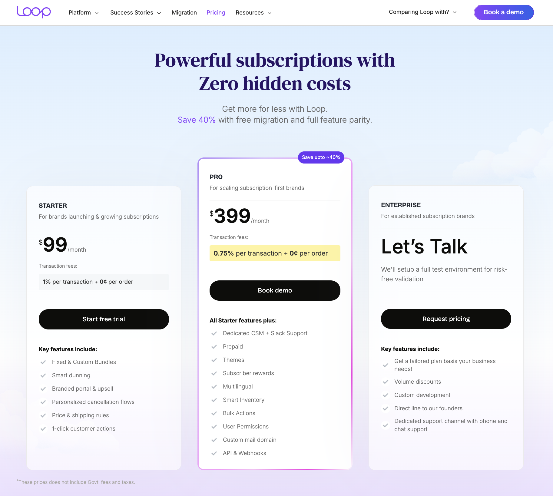 Many brands are switching to Loop for its outstanding support and competitively priced plans with extensive features. Loop’s platform, developed with input from the direct-to-consumer community, addresses modern business needs with features such as fully customizable bundles and portals, integrated smart dunning management, Loop Flows for automated and personalized subscriber experiences, and superior cancellation flows. Loop’s flexible pricing model includes a low transaction fee of 0.75% of the total subscription value, with no additional hidden fees.