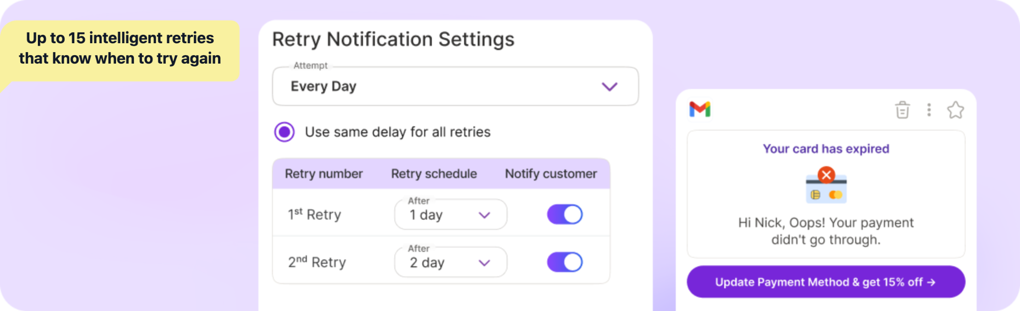 Retry silently first. The subscriber doesn't need a "payment failed" email on day one—there's a good chance the next retry succeeds. Loop lets you run silent retries and hold notifications until subscriber action is actually needed.