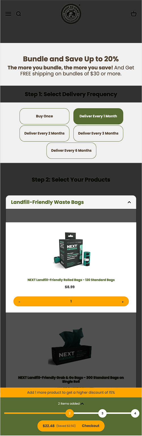 Bottom sticky bar shows current bundle total with "Discount!" indicator and progress slider, providing immediate feedback on savings achieved and encouraging additional selections.