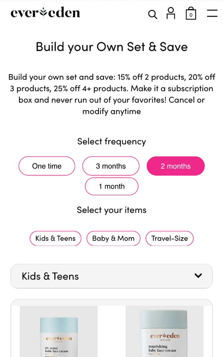 EverEden’s clear discount messaging encourages bulk purchases with savings tiers. Frequency selection and category tabs streamline shopping, while real-time cart updates and a sticky progress bar create urgency for more savings.