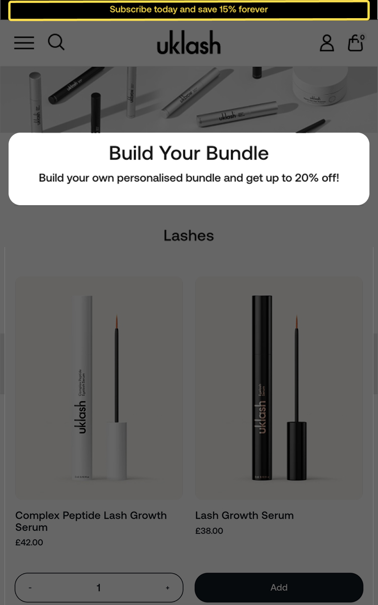 UKLash’s clear savings messaging encourages larger bundles, while simple quantity controls simplify product selection. The progress banner reinforces savings milestones, motivating continued purchases.