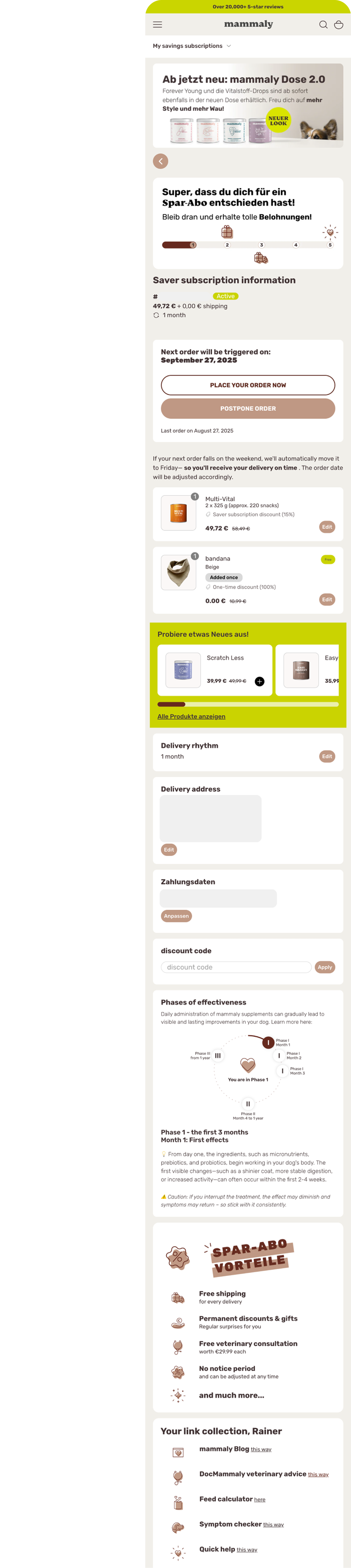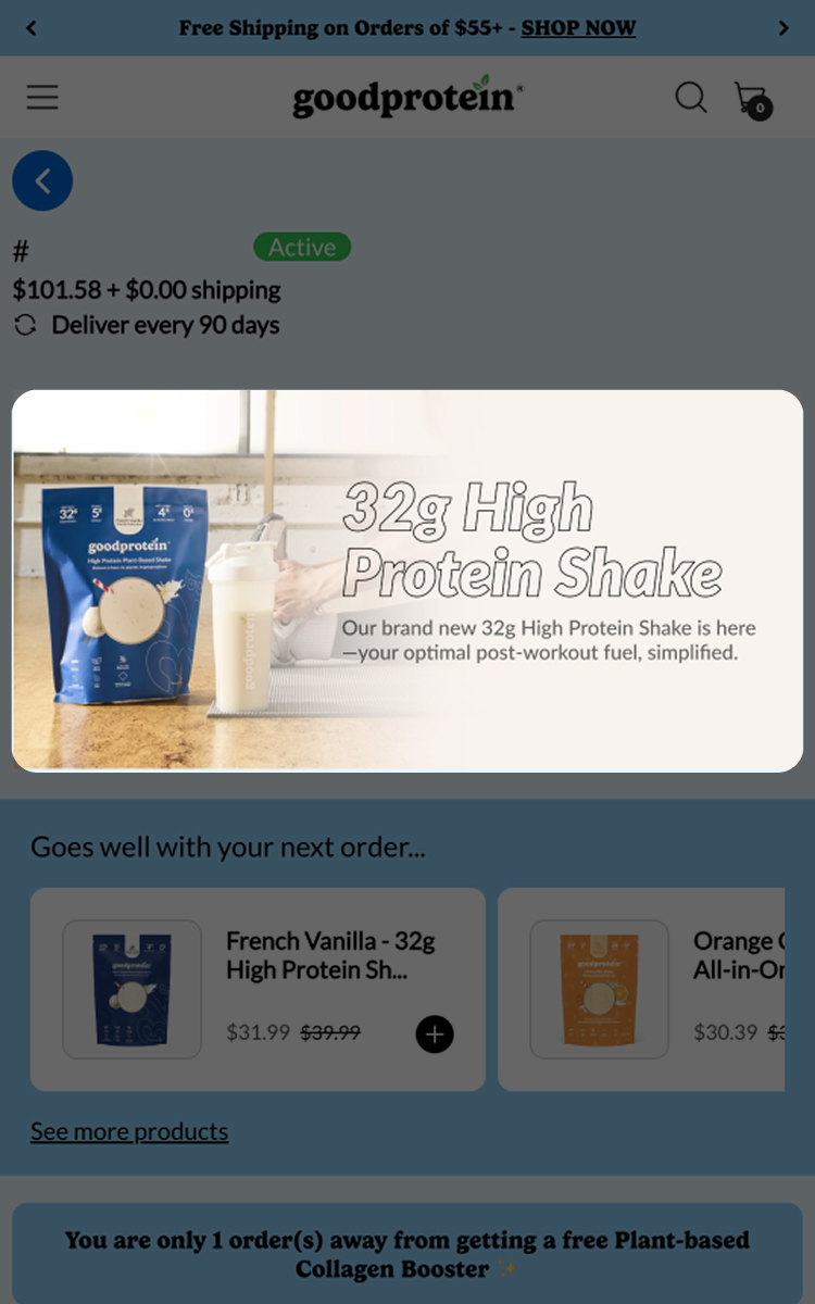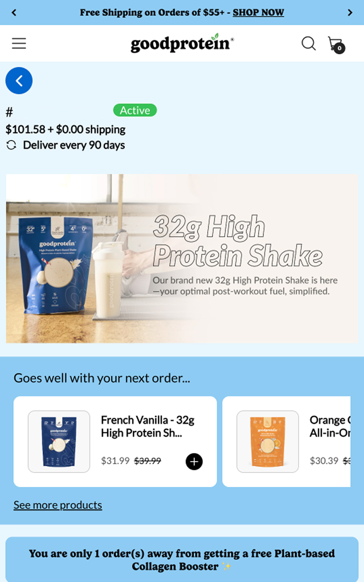 The simplified navigation, "Goes well with" upsell language, multiple quick actions, integrated FAQ section, and clear delivery frequency display improve user experience by reducing clutter and guiding purchases effectively.