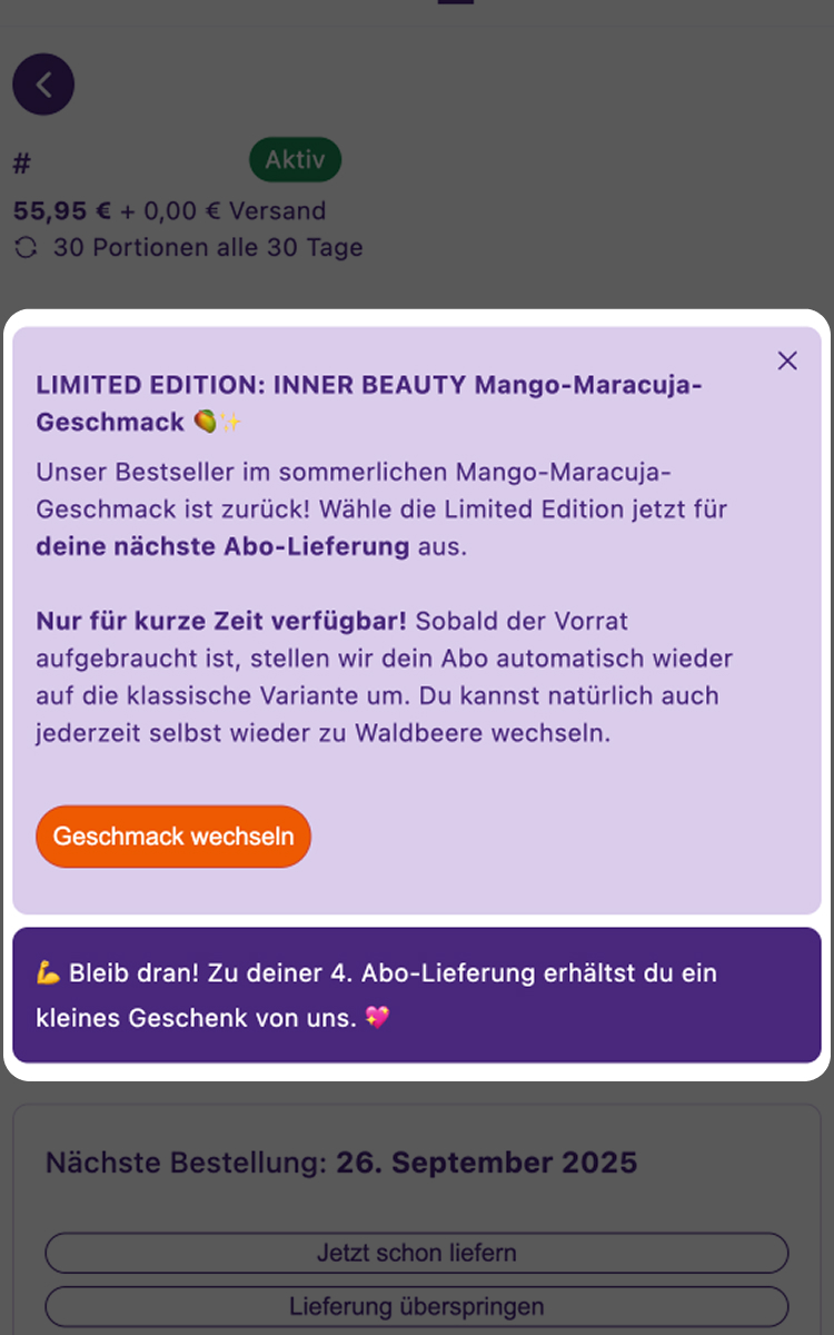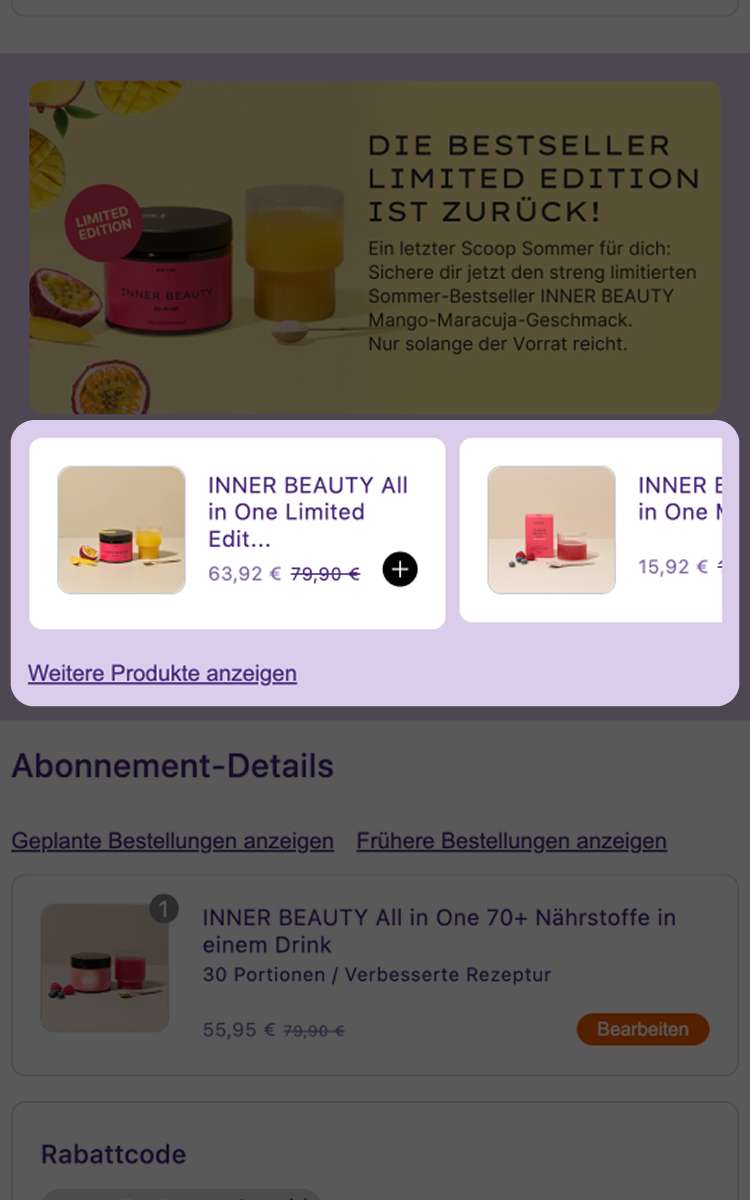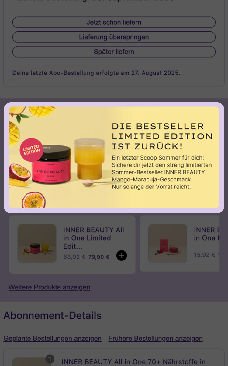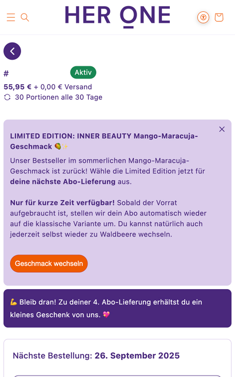 The product-first layout strategy, limited edition promotions, visual product cards, clear delivery rhythm display, and separate billing/shipping addresses create an organized, user-focused experience that promotes key offers and simplifies navigation.