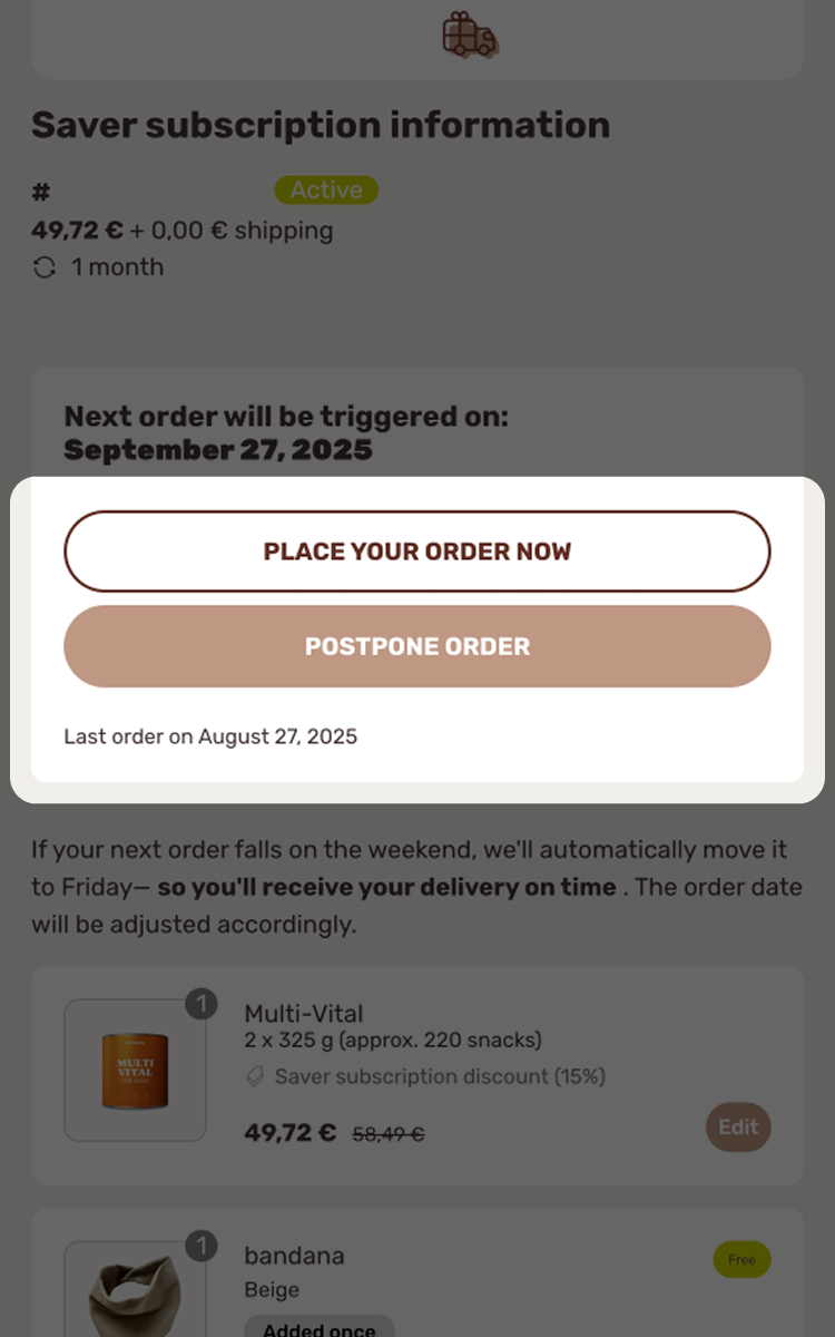 "POSTPONE ORDER" vs "Skip" reduces cancellation psychology, with "Postpone" decreasing cancel intent by 22%.