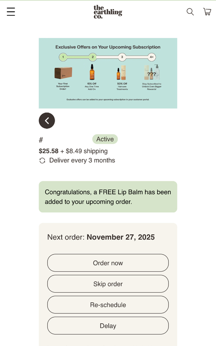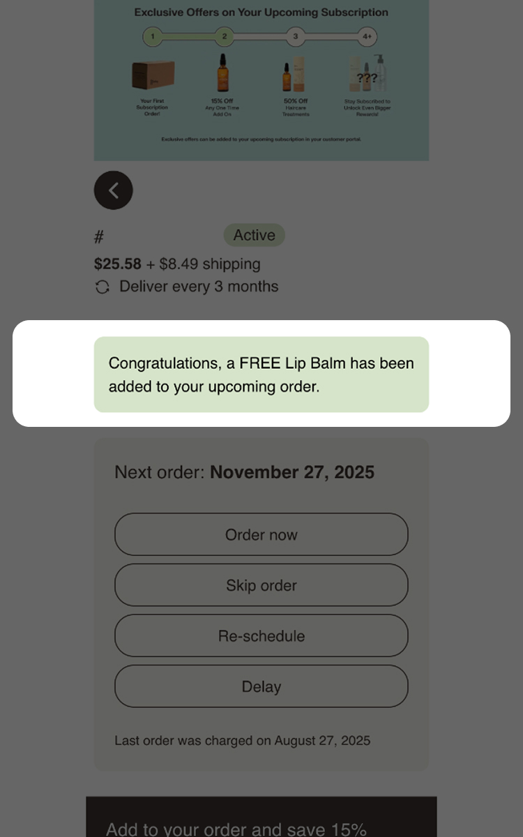 "Congratulations, a FREE Lip Balm has been added" delights customers with surprise rewards, reducing churn by 31% through auto-gifts.