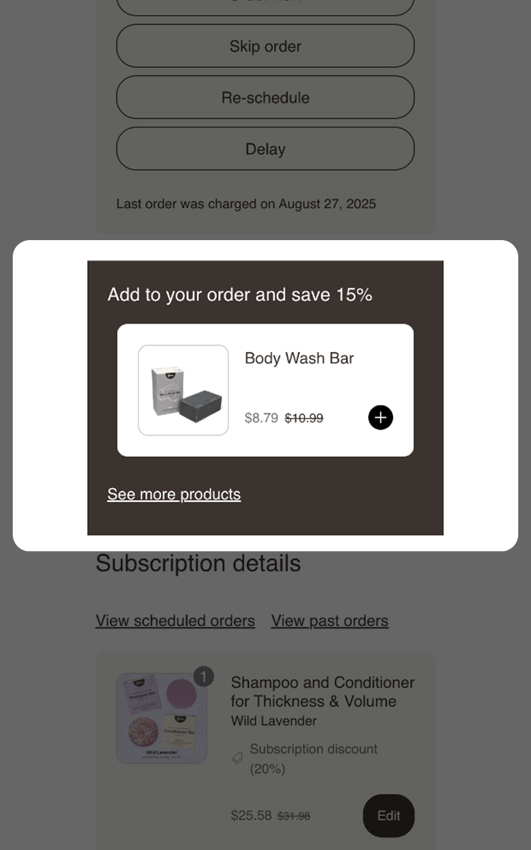 Add the "Body Wash Bar" for 15% off, increasing order value with a simple click.