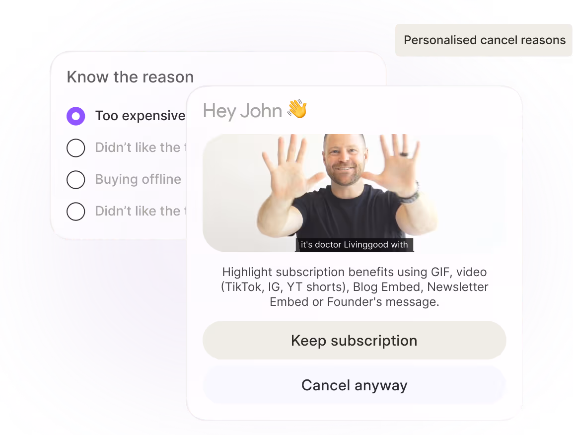 Different customers get different retention offers. Show founder videos, reason-specific actions, and smart discounting to prevent cancellations.