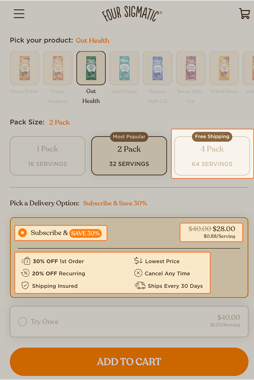 On 4-Pack boosts AOV, while "Most Popular" on 2-pack serves as a psychological anchor.