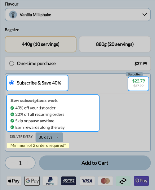 "Minimum of 2 orders required*" is strategically placed at the bottom in smaller text - visible for transparency but not prominent enough to create friction at decision point.